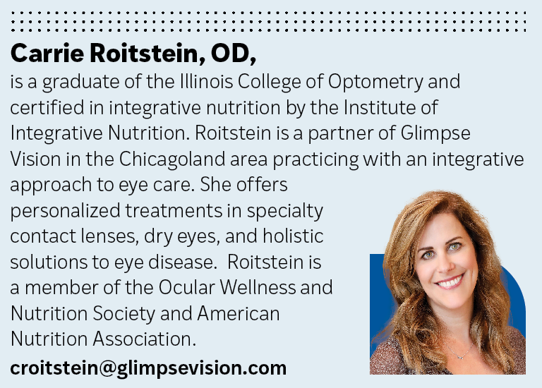Parents are not looking for dietary recommendations during an eye exam, but a simple mention of eating less sugar and fewer processed foods with more attention to whole foods and eating colors can start the dialogue. If a child’s symptoms are not explained by refractive error or an eye condition, consider a referral for further medical testing. As a health care professional, you can suggest a possible link to poor nutritional habits that deserves more attention.